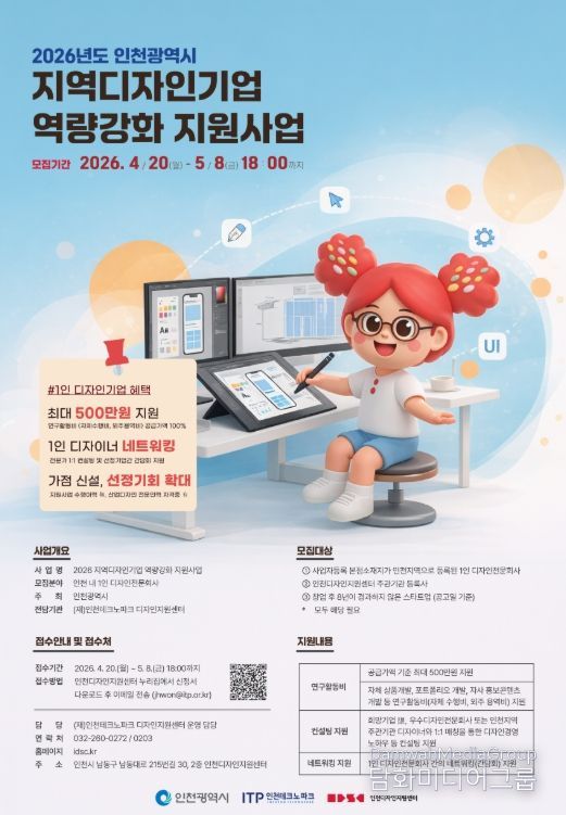 시민행정신문 이세훈 기자 | 인천테크노파크(인천TP)는 오는 5월 8일까지 지역 디자인 산업의 경쟁력 강화를 위한 ‘2026 지역디자인기업 역량강화 지원사업’에 참여할 1인 디자인기업을 모집한다고 밝혔다.