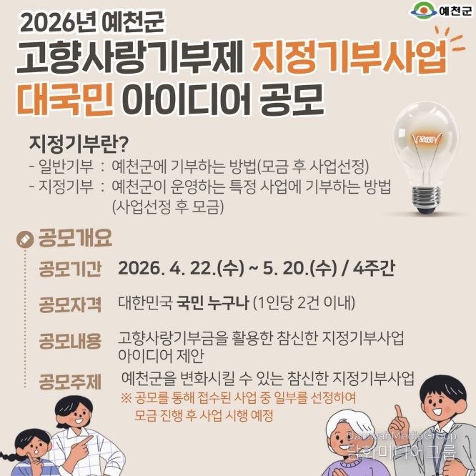 시민행정신문 강갑수 기자 | 예천군은 기부자가 사업 목적에 공감하고 직접 수혜 대상을 결정하는 ‘고향사랑 지정기부제’를 적극 도입하기로 하고, 그 첫걸음으로 4월 22일부터 5월 20일까지 '2026년 예천군 고향사랑기부제 지정기부사업 아이디어 공모전'을 열어 국민들의 참신한 제안을 받는다.