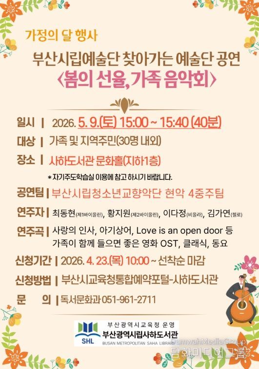 시민행정신문 기자 | 부산광역시립사하도서관은 가정의 달을 맞아 다음달 9일 오후 3시 도서관 문화홀에서 지역주민 30명을 대상으로 부산시립예술단 찾아가는 예술단 공연 ‘봄의 선율, 가족 음악회’를 개최한다.