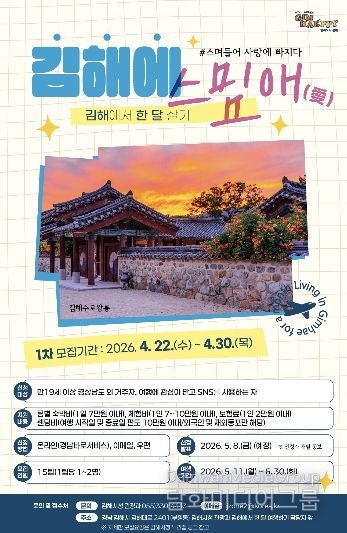 시민행정신문 강갑수 기자 | 김해시는 머무르는 여행지로 도약하기 위해 김해 한 달 여행 프로그램 ‘김해에 스밈애(愛)’ 1차 참가자를 모집한다고 22일 밝혔다.