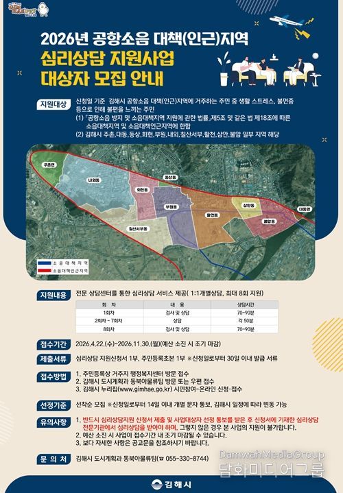 시민행정신문 강갑수 기자 | 김해시는 공항소음 대책(인근)지역 주민을 대상으로 심리상담 지원사업 참여자를 모집한다고 22일 밝혔다.