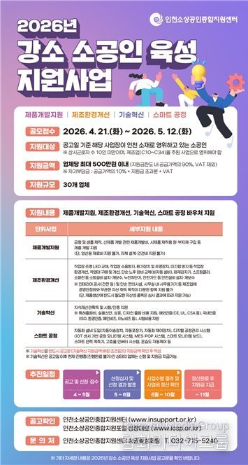 신청 대상은 공고일 기준 인천시에 사업장을 두고 제조업을 주된 업종으로 영위하는 소공인이며, 접수는 4월 21일부터 5월 12일까지 인천소상공인종합지원센터 방문 또는 우편을 통해 가능하다.
