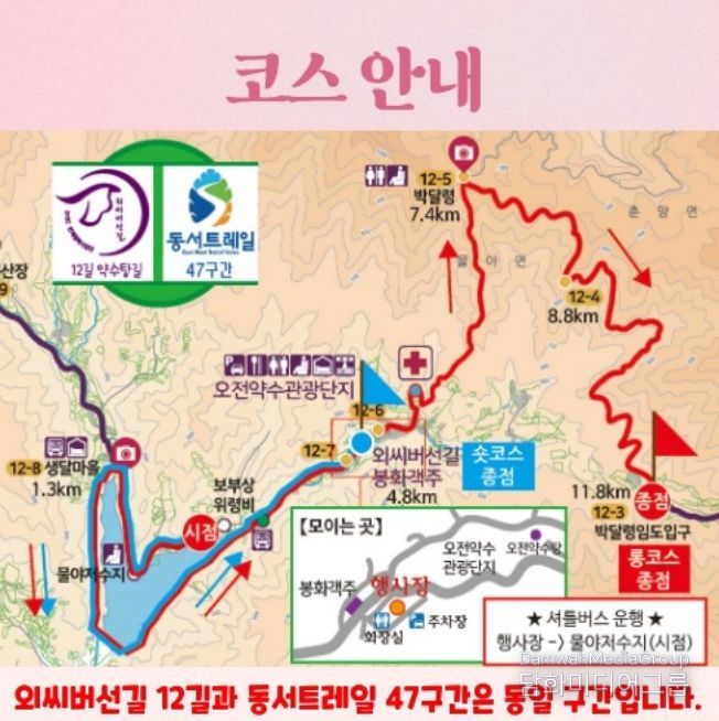 둘째 날인 6월 6일(토)에는 톡 쏘는 탄산 약수로 이름난 오전약수탕을 지나는 ‘약수탕길(12길)’힐링 코스가 이어진다. 가족 단위 참가자를 고려해 ▲숏코스(4.8km)와 ▲롱코스(11.8km)로 나누어 운영하며, 코스당 각각 250명씩 총 500명을 선착순 모집할 계획이다.