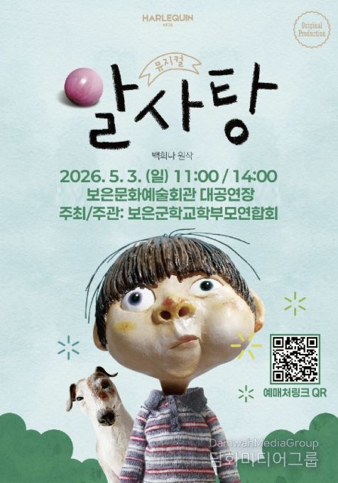 어린이주간 기념 가족 뮤지컬 ‘알사탕’ 공연은 5월 3일 오전 11시와 오후 2시 보은문화예술회관에서 열린다. 백희나 작가의 동명 그림책을 원작으로 한 따뜻한 성장 이야기를 담았다. 관람은 무료이며 티켓링크를 통한 사전 예매로 진행된다.