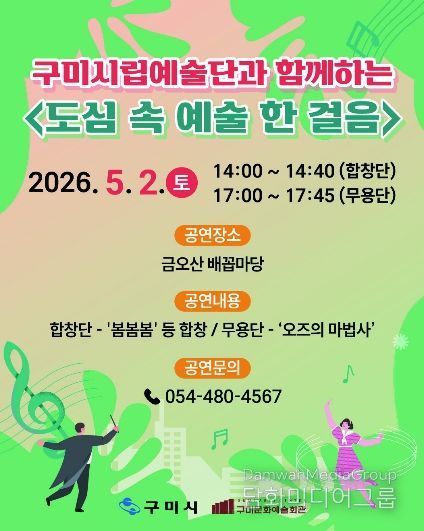 시민행정신문 강갑수 기자 | 구미시는 가정의 달을 맞아 5월 2일 금오산 배꼽마당에서 구미시립예술단과 함께하는 야외공연 '도심 속 예술 한 걸음'을 개최한다.
