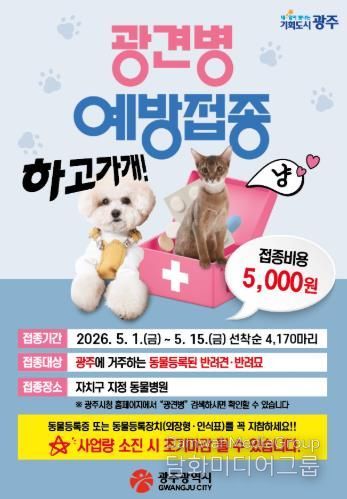 시민행정신문 김학영 기자 | 광주광역시는 반려동물과 시민의 건강을 지키기 위해 5월 1일부터 15일까지 ‘봄철 광견병 예방접종 사업’을 추진한다.