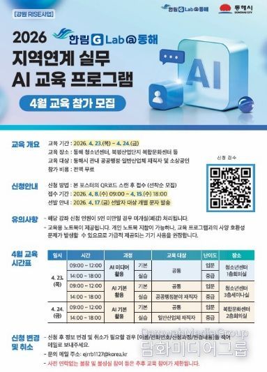시민행정신문 강갑수 기자 | 동해시와 한림대학교(총장 최양희)는 동해시 청소년센터와 북평산업단지 복합문화센터에서 공공행정 및 지역 산업체 종사자를 대상으로 직무 특성에 맞춘'한림 G-Lab@동해 지역 연계 실무형 AI 교육 프로그램'을 운영한다고 밝혔다.
