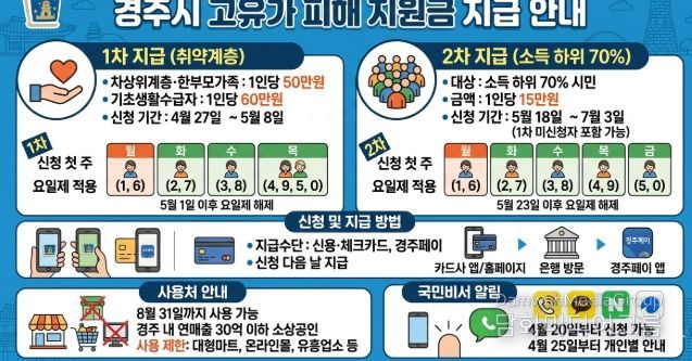 지급수단은 신용·체크카드 또는 경주페이 카드 중 선택할 수 있으며, 신청 다음 날 지급된다.