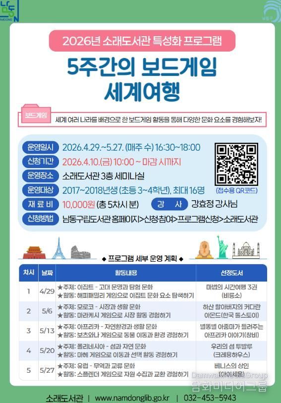 시민행정신문 강갑수 기자 | 인천시 남동남동구립도서관은 지역주민들에게 다채로운 독서문화 체험의 장을 제공하기 위해 ‘2026년 특성화 프로그램’을 운영한다고 22일 밝혔다.