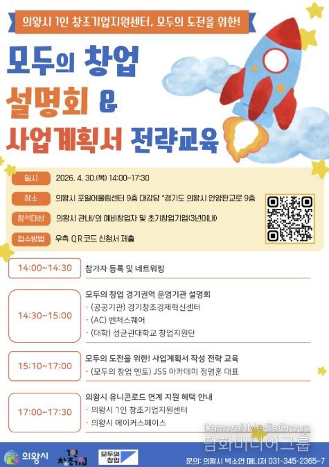 시민행정신문 강갑수 기자 | 의왕시 1인 창조기업지원센터는 4월 30일, 창업을 희망하는 예비 및 초기 창업자를 대상으로 ‘모두의 창업’ 설명회 및 전략 교육을 개최한다.