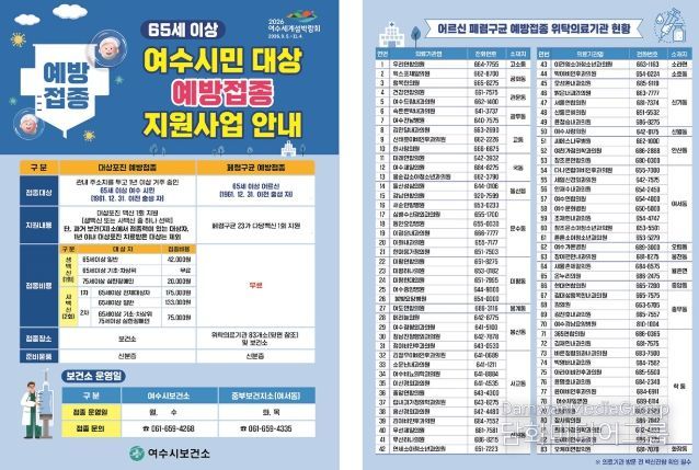 시민행정신문 강갑수 기자 | 여수시는 65세 이상(1961. 12. 31. 이전 출생자) 여수 시민을 대상으로 폐렴구균 및 대상포진 예방접종 비용을 지원한다고 밝혔다.