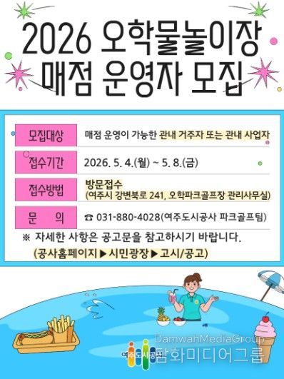 시민행정신문 강갑수 기자 | 여주도시공사는 2026년 오학물놀이장 운영을 앞두고 이용객 편의 제공을 위한 매점 운영자를 공개 모집한다고 밝혔다.