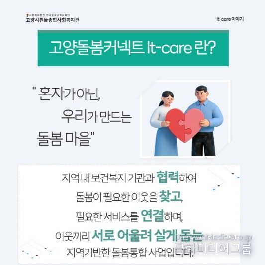 고양돌봄커넥트 It-care 사업은 복합적인 위기에 처한 주민들이 지역사회 안에서 건강하고 독립적인 생활을 유지할 수 있도록 보건과 복지 서비스를 하나로 잇는 통합돌봄 체계를 구축하는 사업이다.