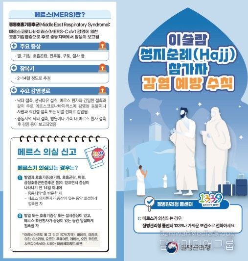 시는 성지순례 기간을 앞두고 사우디아라비아 방문객 증가가 예상됨에 따라 메르스(MERS)와 수막구균 감염증 등 감염병 예방을 위한 개인위생 관리에 각별한 주의가 필요하다고 22일 밝혔다.