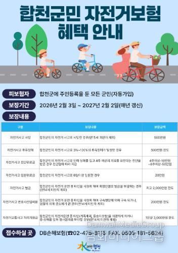 장재혁 합천군수 권한대행은 “자전거 이용 증가에 따라 사고 위험도 함께 높아지고 있는 만큼, 군민 자전거보험을 통해 사고 발생 시 경제적 부담을 덜고 보다 안전하게 자전거를 이용할 수 있도록 지원하고 있다”며 “앞으로도 자전거도로 정비와 안전시설 확충 등 다양한 정책을 통해 안전한 자전거 환경 조성에 힘쓰겠다”고 밝혔다.