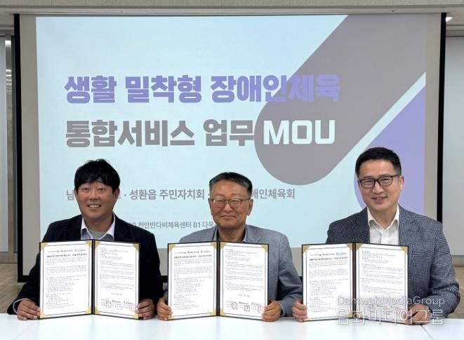 시민행정신문 강갑수 기자 | 천안시장애인체육회는 22일 천안반다비체육센터에서 성환읍 주민자치회, 남서울대학교와 ‘생활밀착형 장애인체육 통합서비스 구축을 위한 업무협약’을 체결했다.