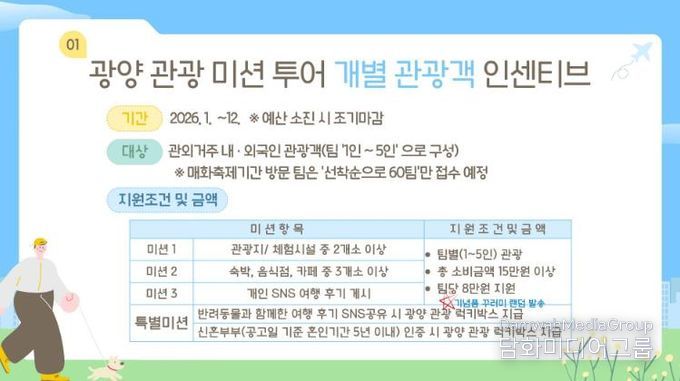광양관광 인센티브는 기업 연수·회의 등 마이스(MICE)를 포함한 단체관광, 윤동주 테마관광, 개별 미션투어 등으로 구성돼 여행 형태에 따라 선택해 이용할 수 있다.