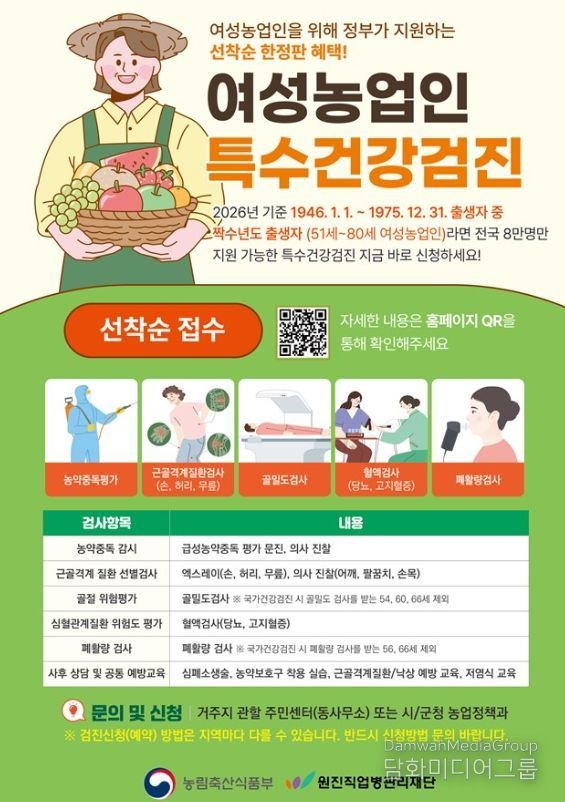 정종복 기장군수는 “여성농업인은 농업 현장에서 중요한 역할을 수행하고 있음에도 건강관리 사각지대에 놓이기 쉬운 실정이다”라며, “이번 사업을 통해 질병을 조기에 예방하고 건강한 농업활동을 이어갈 수 있도록 적극 지원하겠다”고 말했다.