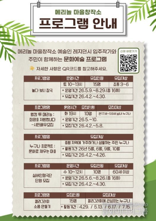 이와 함께 주민이 마을 기반 문화프로그램을 직접 기획·운영하는 ‘누구나 프로젝트 : 문화로 채우는 마을’, 60세 이상을 대상으로 한 ‘실버인형극단’, 생활 속 예술 체험을 돕는 ‘캘리그라피 소품 만들기’ 등 다양한 참여형 프로그램이 운영된다.