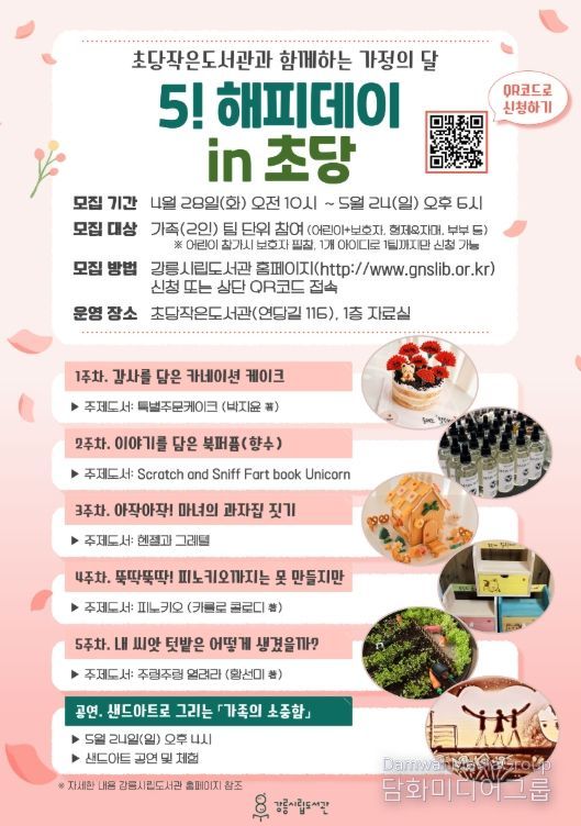 시민행정신문 강갑수 기자 | 강릉시립도서관은 초당작은도서관에서 가정의 달을 맞아 온 가족이 함께 참여할 수 있는 특별 프로그램 ‘5! 해피데이 in 초당’을 운영한다.