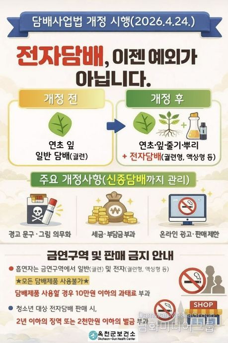 보건소 관계자는 “이번 개정은 전자담배 등 신종 담배로부터 청소년을 보호하고 국민 건강을 지키기 위한 중요한 제도 개선”이라며 “군민들께서는 변경된 법 내용을 숙지하고 적극 협조해 주시길 바란다”고 말했다.