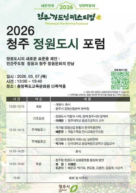 시 관계자는 “이번 포럼이 청주형 정원도시 모델을 정립하는 계기가 되기를 기대한다”며 “정원문화 확산을 통해 시민 삶의 질을 높이고 지속가능한 도시로 발전해 나가겠다”고 밝혔다.