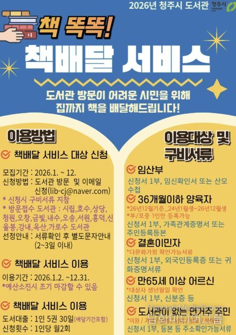 시민행정신문 강갑수 기자 | 청주시는 도서관 방문이 어려운 독서 취약계층을 위해 운영 중인 ‘책 똑똑! 책배달 서비스’ 신청자가 600명을 돌파했다고 23일 밝혔다.