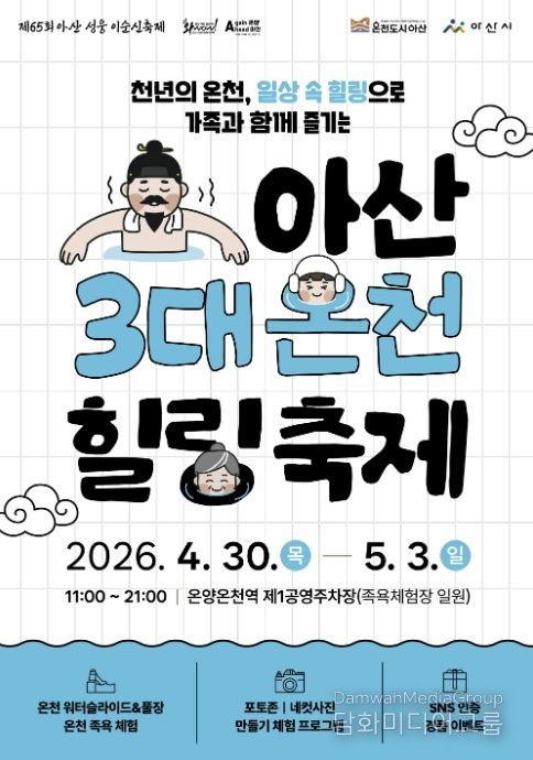 시민행정신문 기자 | 아산시가 ‘제65회 아산 성웅 이순신 축제’와 연계해 오는 4월 30일부터 5월 3일까지 체험‧홍보형 관광 프로그램인 ‘아산 3대 온천힐링축제’를 함께 진행한다.