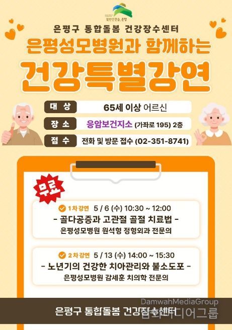 시민행정신문 강갑수 기자 | 서울 은평구는 다음 달 6일과 13일 구민의 건강한 노후생활을 지원하기 위해 65세 이상 어르신을 대상으로 ‘건강특별강연’을 운영한다고 밝혔다.