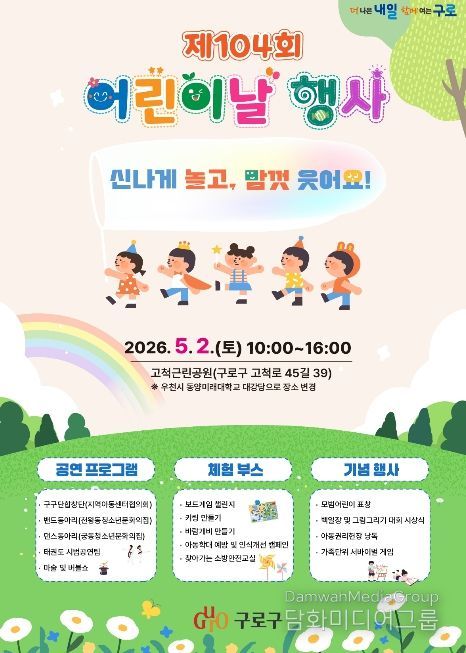 시민행정신문 이존영 기자 | 구로구가 제104회 어린이날을 맞아 오는 5월 2일 고척근린공원에서 어린이와 가족, 지역주민이 함께 즐길 수 있는 ‘어린이날 행사’를 개최한다.