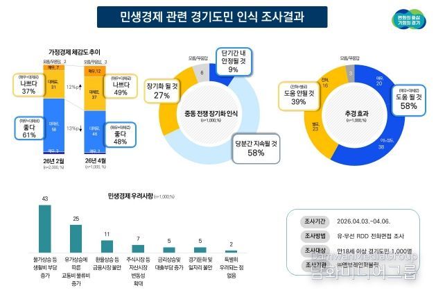 정두석 경기도 기획조정실장은 “가정 경제 형편이 두 달 만에 급격히 나빠졌다는 조사 결과는 현재 민생 현장의 어려움을 보여준다”며 “추경 예산이 빠르게 집행될 수 있도록 도의회와 긴밀히 협의하여 고유가와 고물가로 고통받는 도민들의 부담을 덜어드리도록 하겠다”고 밝혔다.