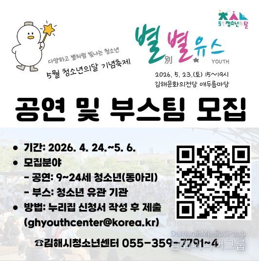 시민행정신문 강갑수 기자 | 김해시청소년센터는 청소년이 직접 기획하고 참여하는 2026년 청소년의 달 기념 축제 ‘별별유스’를 앞두고 공연 및 체험 부스 참가팀 모집에 나섰다고 밝혔다.