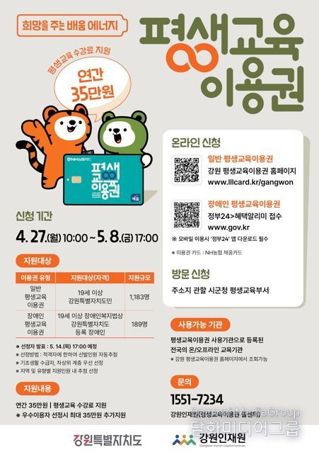 시민행정신문 강갑수 기자 | 홍천군이 경제적 여건에 따른 교육 격차를 줄이고 평생교육 소외계층 성인의 자아실현을 돕기 위해 ‘2026년 강원특별자치도 평생교육이용권 2차 신청’을 4월 27일부터 5월 8일까지 받는다.