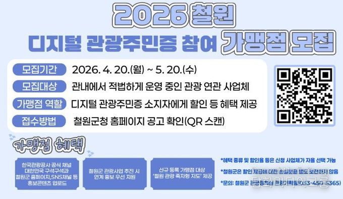 철원군 관광정책실은 지역 관광 산업의 경쟁력을 높이고 외지 방문객의 지속적인 유입을 도모하기 위해 ‘2026년 철원군 디지털 관광주민증’ 참여 가맹점을 신규 모집한다고 밝혔다.