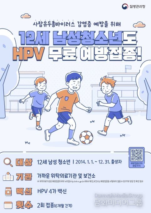 기존에는 여성청소년과 일부 저소득층 여성에게 제공되던 무료 접종이 12세 남성 청소년(2014년생) 대상으로 총 2회(6개월 간격) 무료 접종을 시작한다.