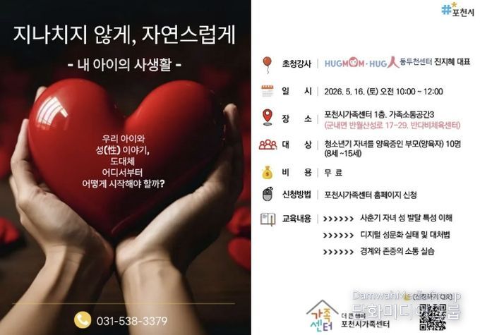 시민행정신문 강갑수 기자 | 포천시 직영 더 큰 행복 포천시가족센터는 오는 21일부터 사춘기 자녀를 둔 양육자를 대상으로 부모 교육 프로그램 ‘지나치지 않게, 자연스럽게’의 참여자를 모집한다. 이번 교육은 5월 16일 오전, 포천시가족센터 가족소통공간(반다비체육센터 1층)에서 대면 강의로 진행된다.