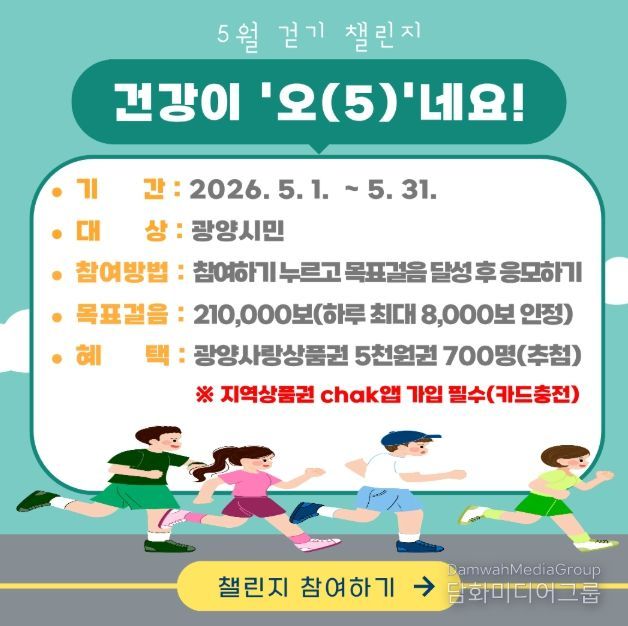 광양시 관계자는 “걷기는 일상에서 쉽게 실천할 수 있는 건강 습관”이라며 “이번 챌린지를 통해 시민들이 걷기의 즐거움을 느끼고 건강한 생활을 이어가길 바란다”고 말했다.