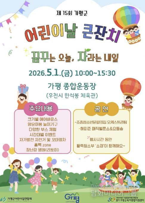 시민행정신문 기자 | 가평군은 오는 5월 1일 오전 10시 가평종합운동장에서 ‘제15회 가평군 어린이날 기념행사’를 개최한다. 가평군어린이집연합회와 가평군육아종합지원센터가 공동 주관하는 이번 축제는 기념행사와 공연, 놀이, 체험 부스 등 다채로운 프로그램으로 꾸며진다.