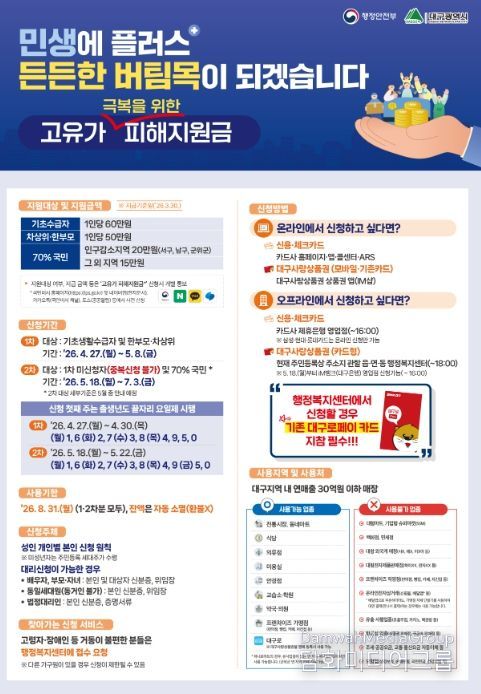 지원금은 유흥·사행업종을 제외한 대구광역시 내 연매출 30억원 이하 소상공인 매장에서 사용 가능하며, 사용기한은 8월 31일까지로 기한 내 미사용 금액은 자동 소멸된다.