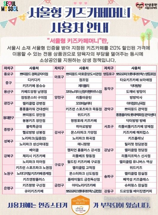 민간 키즈카페 이용 부담을 덜어주기 위한 ‘서울형 키즈카페머니’도 발행된다. 서울시는 4월 24일 오전 10시, 올해 2차분 15억 원을 특별 발행한다. ‘서울형 키즈카페머니’는 캘리클럽, 뽀로로파크 등 서울시내 62개 민간 인증 키즈카페에서 20% 할인된 금액으로 사용할 수 있으며, ‘서울페이+’ 앱을 통해 1인당 월 20만 원까지 구매 가능하다.