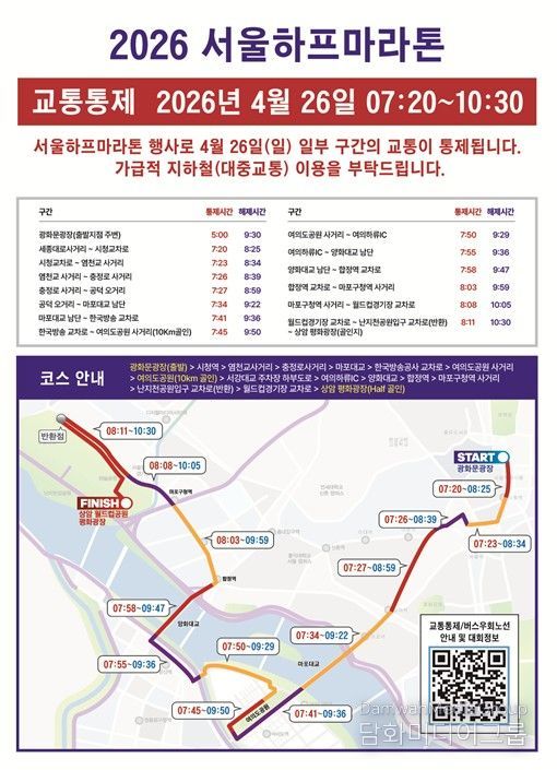 대회 당일 오전 7시 20분부터 10시 30분까지 마라톤 코스에 포함된 도심 주요 도로는 순차적으로 교통 통제되고 시는 참가자 통과 이후 즉시 해제하는 탄력적 통제 방식을 적용해 시민 불편을 최소화할 계획이다.