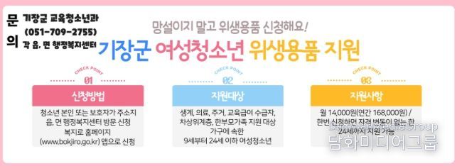 시민행정신문 기자 | 기장군은 ‘2026년 여성청소년 위생용품 지원사업’을 본격 추진한다고 23일 밝혔다.
