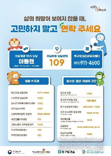 시민행정신문 기자 | 동구보건소는 봄철 자살 고위험 시기(3월~5월)를 맞아 생명존중 문화 확산과 자살예방을 위한 집중 관리 및 홍보를 추진한다고 밝혔다.