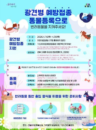 시민행정신문 김학영 기자 | 광진구는 반려동물의 건강 증진과 구민의 안전을 위해 ‘2026년 봄철 광견병 예방접종’ 지원을 4월 30일까지 시행한다.