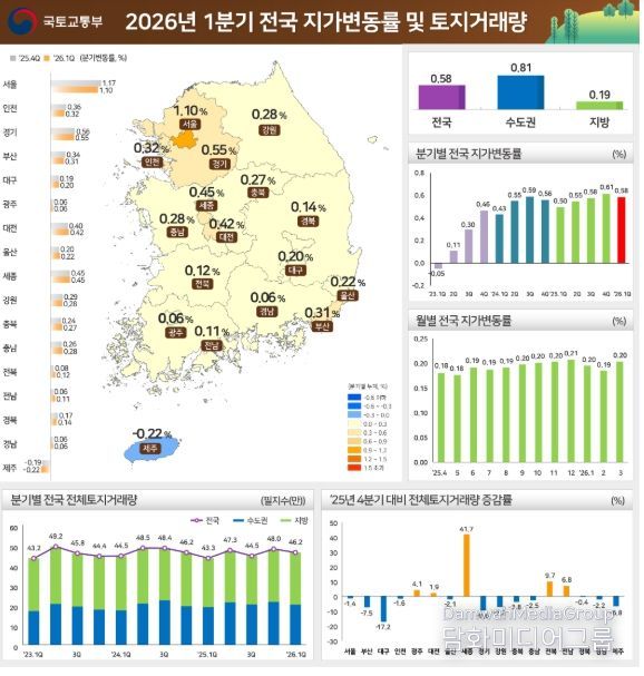 시민행정신문 이세훈 기자 | 국토교통부와 한국부동산원(원장 이헌욱)은 '26년 1분기 지가변동률 및 토지거래량을 발표했다.