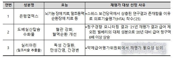 개편 평가체계에 따라 2026년도 평가 대상으로 은행엽엑스, 도베실산칼슘수화물, 실리마린(밀크씨슬 추출물) 총 3개 성분이 선정됐으며, 구체적 선정 사유는 아래와 같다.