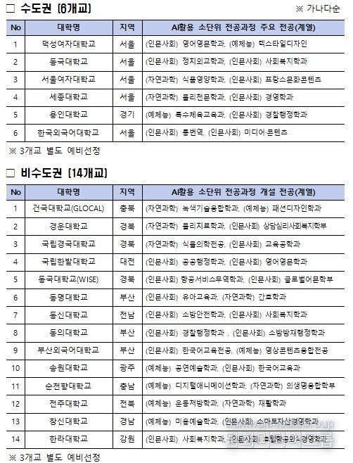 선정 대학은 인공지능(AI)의 윤리적 활용과 비판적 사고 등 인공지능(AI) 전반에 대한 ‘기초 교양 교과’와, 인공지능(AI)을 비공학계열 전공에 활용하는 ‘인공지능(AI) 활용 소단위 전공 과정’을 개발·운영하게 된다. 또한, 학습자에게 양질의 인공지능(AI) 교육을 제공할 수 있도록 교수자 역량 강화와 관리 체계 구축도 병행 추진한다. 개발된 교육과정을 타 대학과 공유하고, 대학 현장 전반에 인공지능(AI) 교육의 확산을 도모한다.