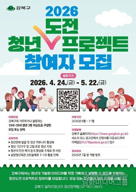 시민행정신문 강갑수 기자 | 서울 강북구는 청년들의 창의적인 아이디어를 지역사회에서 실현할 수 있도록 돕는 ‘2026년 청년도전 프로젝트’ 참여자를 모집한다고 밝혔다.