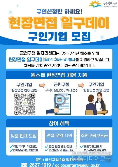 시민행정신문 강갑수 기자 | 금천구는 구인·구직난을 해소하고, 기업의 원활한 채용을 지원하기 위해 ‘현장면접 일구데이’ 참여 기업을 상시 모집한다고 밝혔다.