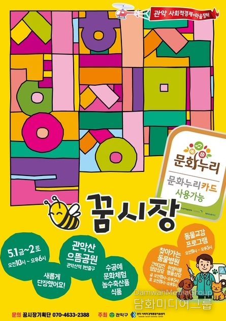 5월 1일부터 이틀간 관악산 으뜸공원에서 열리는 이번 행사는 10시부터 18시까지 ‘꿈시장’이 운영되고, ‘찾아가는 동물병원’은 11시부터 15시까지 이용할 수 있다.